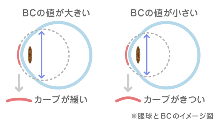 数値が大きくなるほど、コンタクトレンズのカーブは緩やかになります。