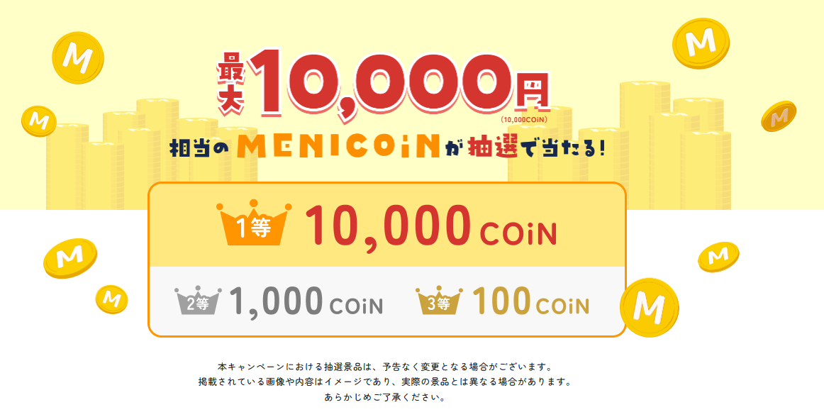 抽選で、 MENICOiN 最大10,000円相当(10,000COiN) が