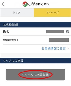 「マイメルス施設」に当店を登録されていない方は、マイメルス施設登録をタップすると、過去の利用歴から登録候補のお店が出てくるので、当店 「Mecnicon Miru町田店」を登録してください。