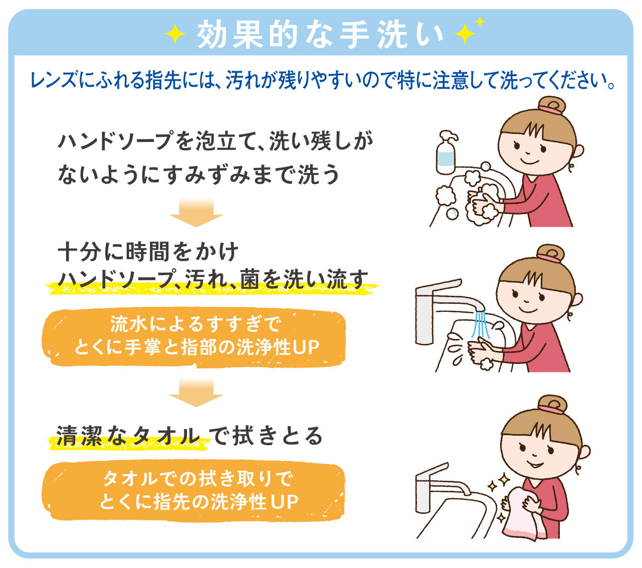 手を洗うときは、特に指先を念入りに洗ってからコンタクトレンズを装用してくださいね☺