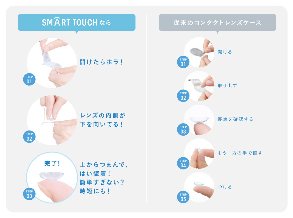 1DAYプレミオとMagic、この2種類はケースが【スマートタッチ】仕様のため、とても簡単にコンタクトレンズをつけることができます!
