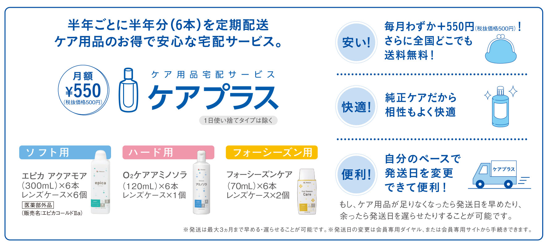 メニコンの純正ケア用品を会員価格で定期的にお届けするサービスです。