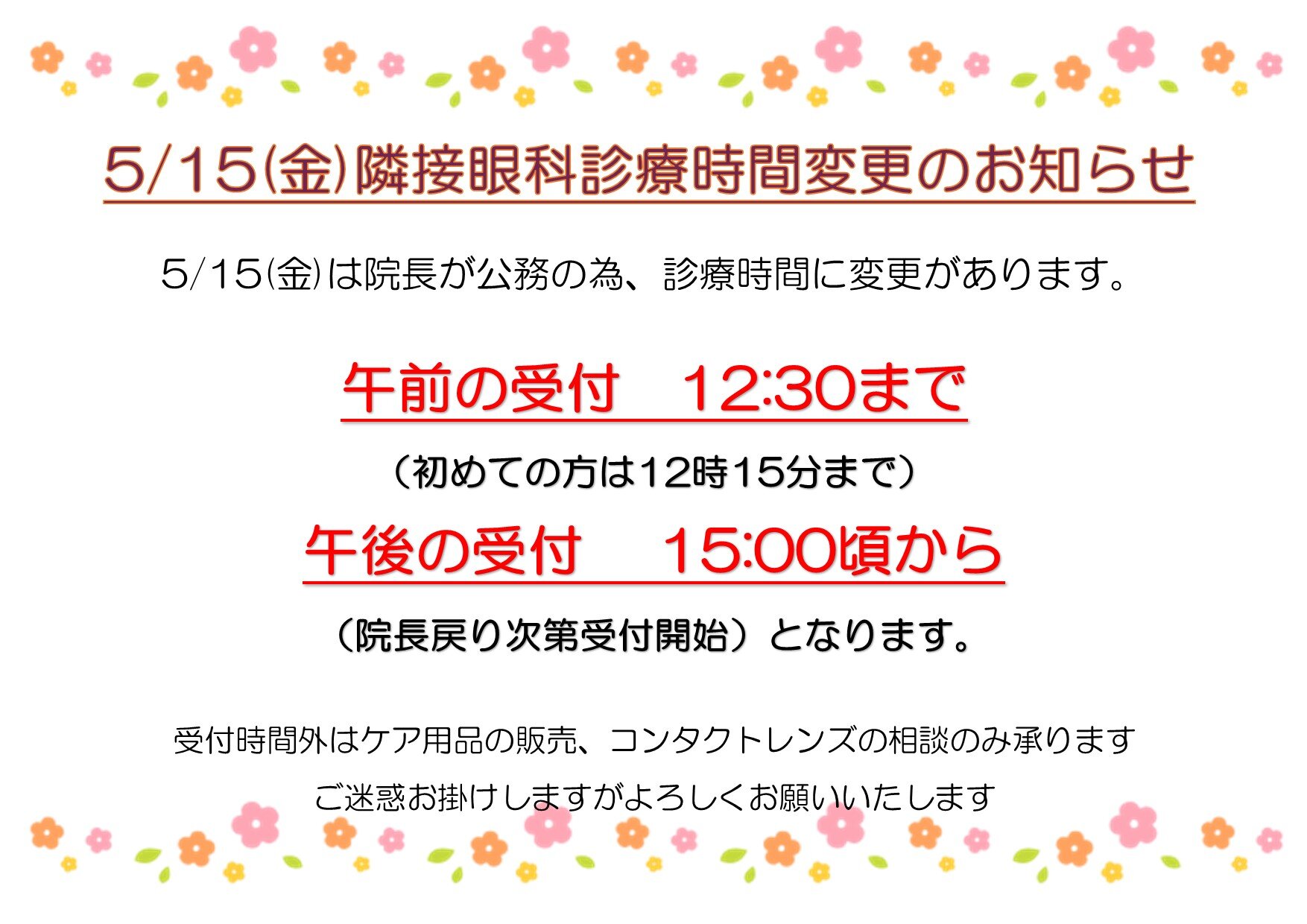 5/15(金)コンタクト受付時間変更のお知らせ