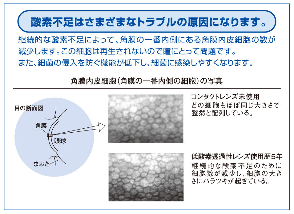コンタクトレンズで酸素をしっかり眼に届けるには、ソフトレンズならシリコーンハイドロゲル素材など、Dk値(酸素透過係数)の高いレンズを使用することをおススメします。